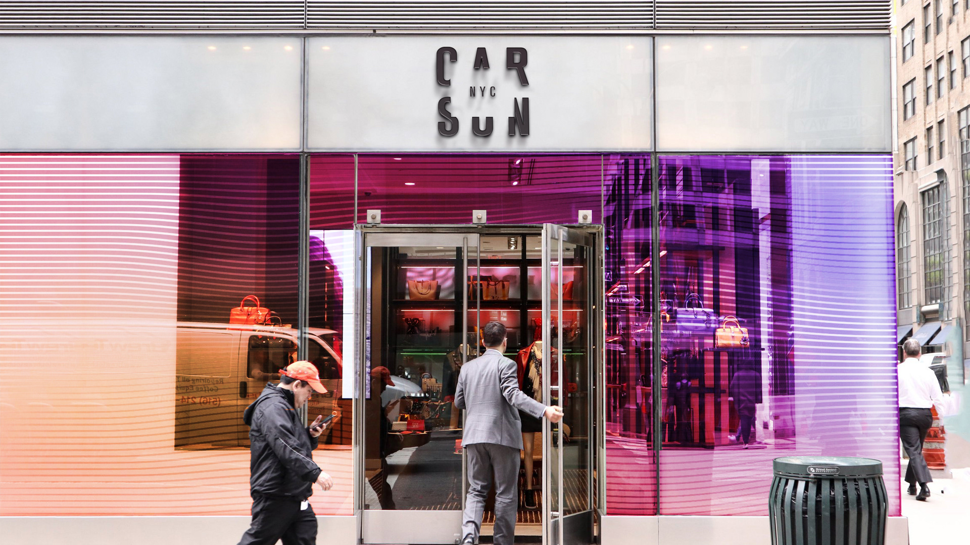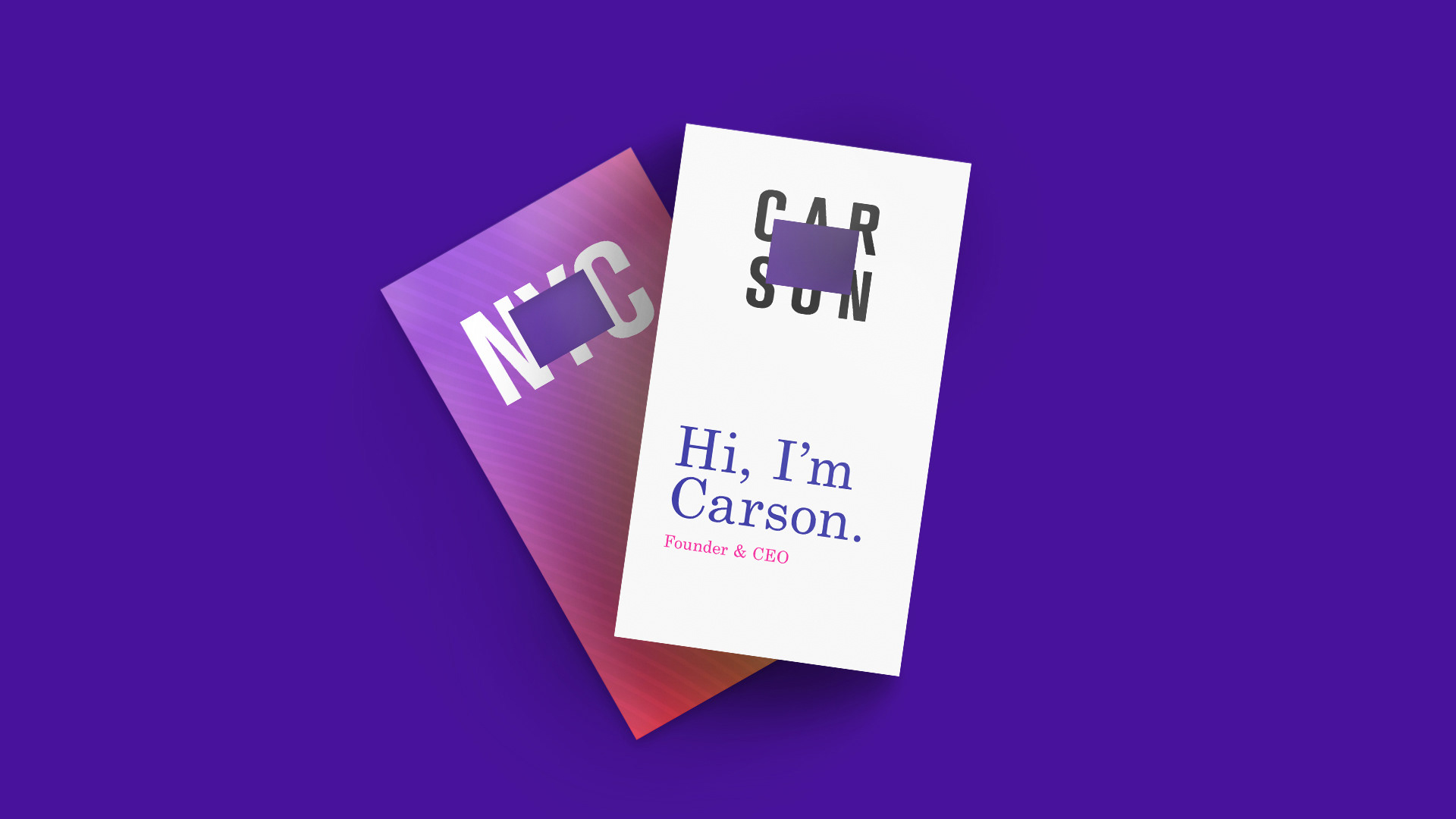 brand identity design, art & creative direction, communication strategy Carson NYC is where New York fashion meets Silicon Valley tech. The up and coming startup came us to for an identity for their new product: a handbag with a built-in screen that syncs to your phone, allowing versatility to change patterns and colors to match any outfit or style. The mark is a reflection of the product itself. In order to stand out in the sea of fashion brands, a dynamic logomark was developed that incorporated constant motion through ambient gradients and line patterns.