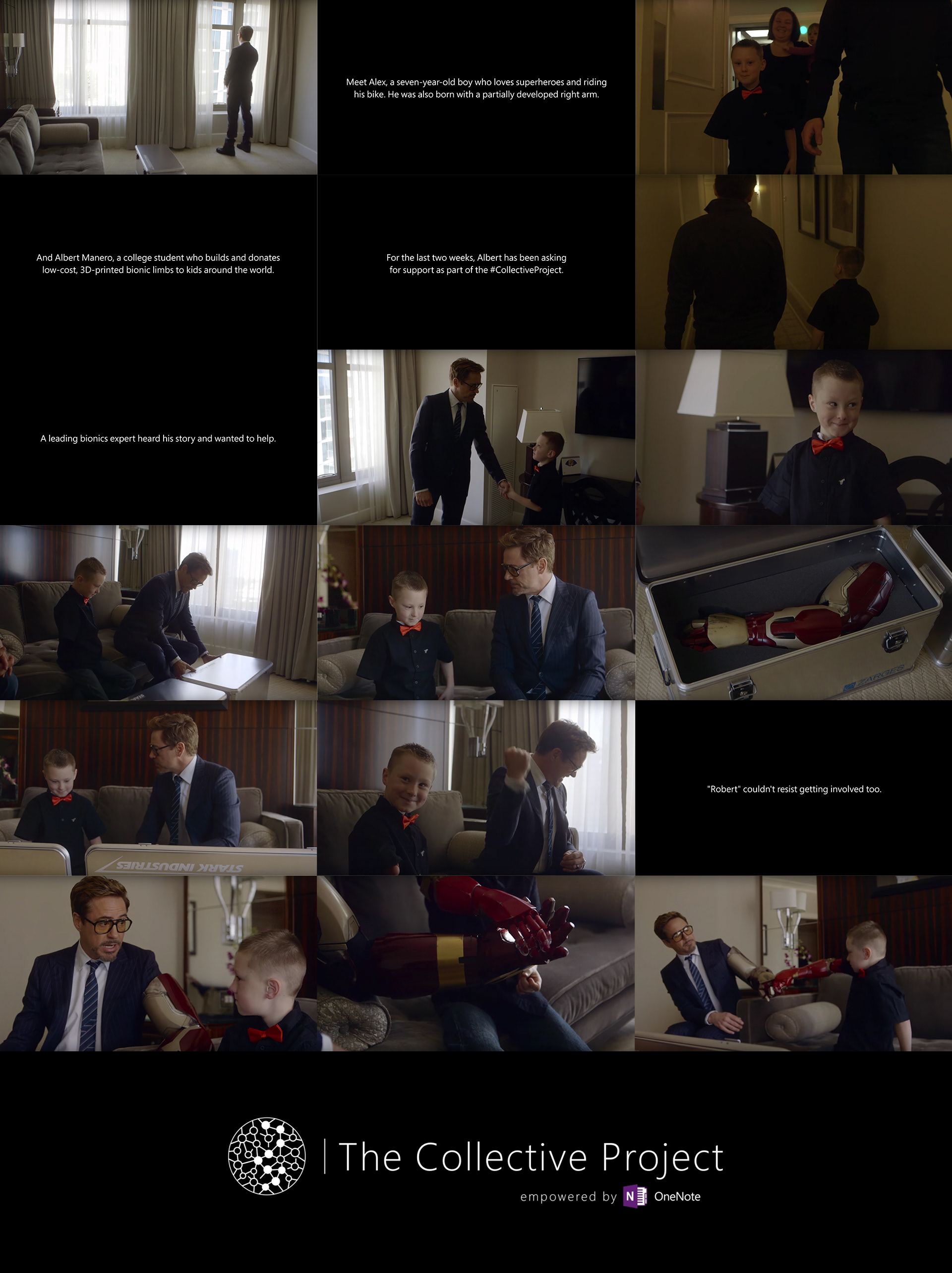 marketing strategy & communication, design The Microsoft Collective Project was an effort between college student entrepreneurs and Microsoft. Using Robert Downey Jr. and his iconic ‘Ironman’ persona, bionic limbs were provided to children in need through the help of Albert Manero and the University of Central Florida. This work was awarded a Cannes Lions Bronze in Film, a One Show Bronze Pencil in Branded Online Content, and a One Show Bronze Pencil in Viral Marketing
